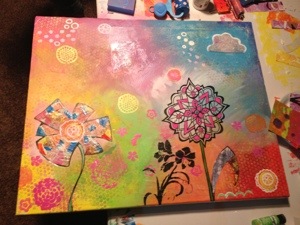 The black flower is from a stencil that I used on the gelli plate. The cloud is ribbon… I used moldable foam and some fake peas and a hamburger bun from my daughter’s toy box to add some cool flower designs.