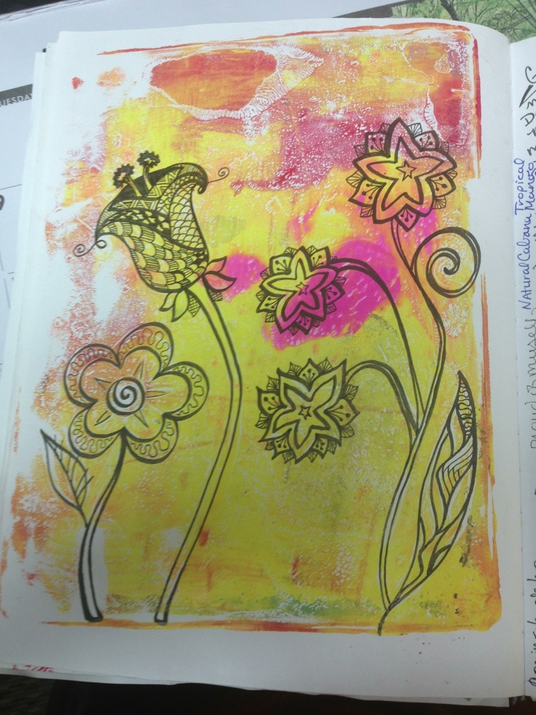 I love the bright colors in this one!!! The background is a gelli print and the flowers are Micron pen…
