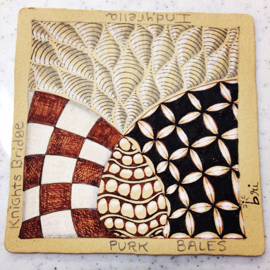 Today I attended the first art class that I’ve taken since college! I have been zentangling for a few years now, but never in a classroom setting… It was fun to have human guidance and really putting names with the different patterns. Also, I had never tangled on brown paper with brown pens and white charcoal before so that was a definite learning experience.