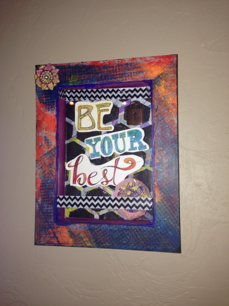 Next step for me was to use my Micron pens to draw out a quote that I love onto heavyweight watercolor paper. I cut out each word individually and used 3d mounting squares to attach.