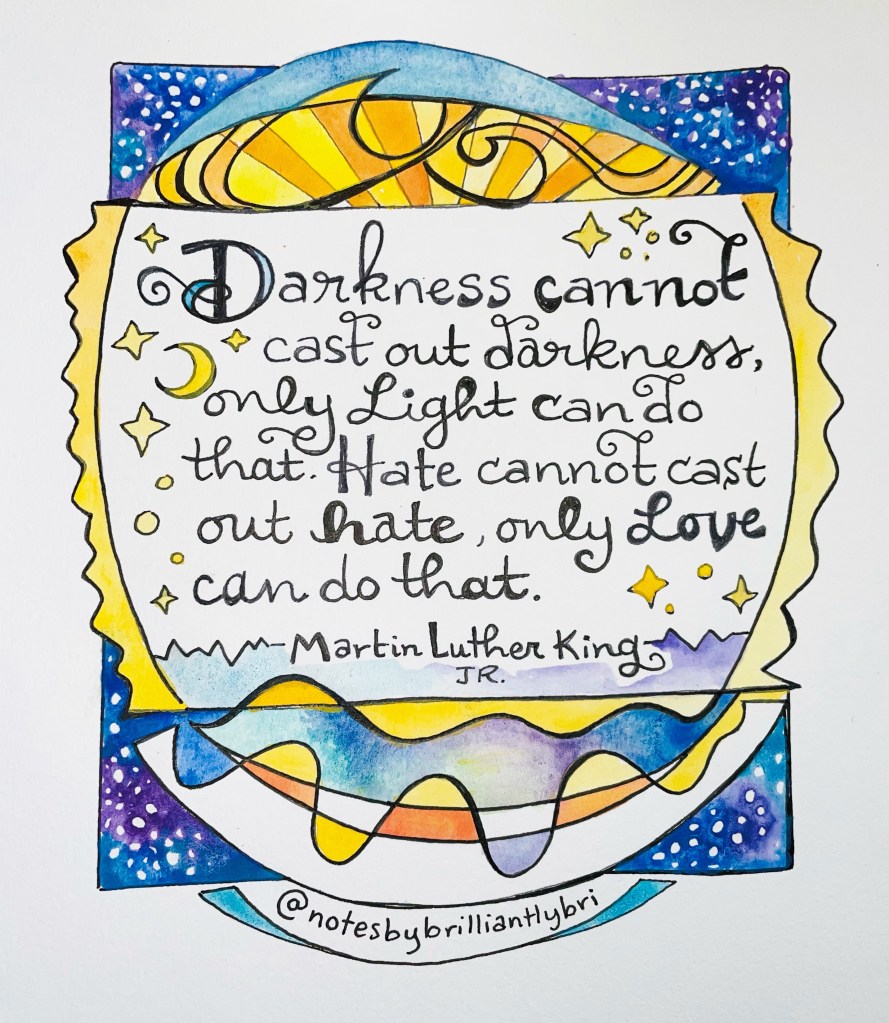 Darkness 0 March 23, 2021 Written by Brilliantly Bri Art Darkness cannot cast out darkness, only Light can do that. Hate cannot cast out hate, only Love can do that. -Martin Luther King Jr. Share this: Click to share on X (Opens in new window) X Click to share on Tumblr (Opens in new window) Tumblr Click to share on Facebook (Opens in new window) Facebook More Click to share on Pinterest (Opens in new window) Pinterest Click to print (Opens in new window) Print Like Loading...