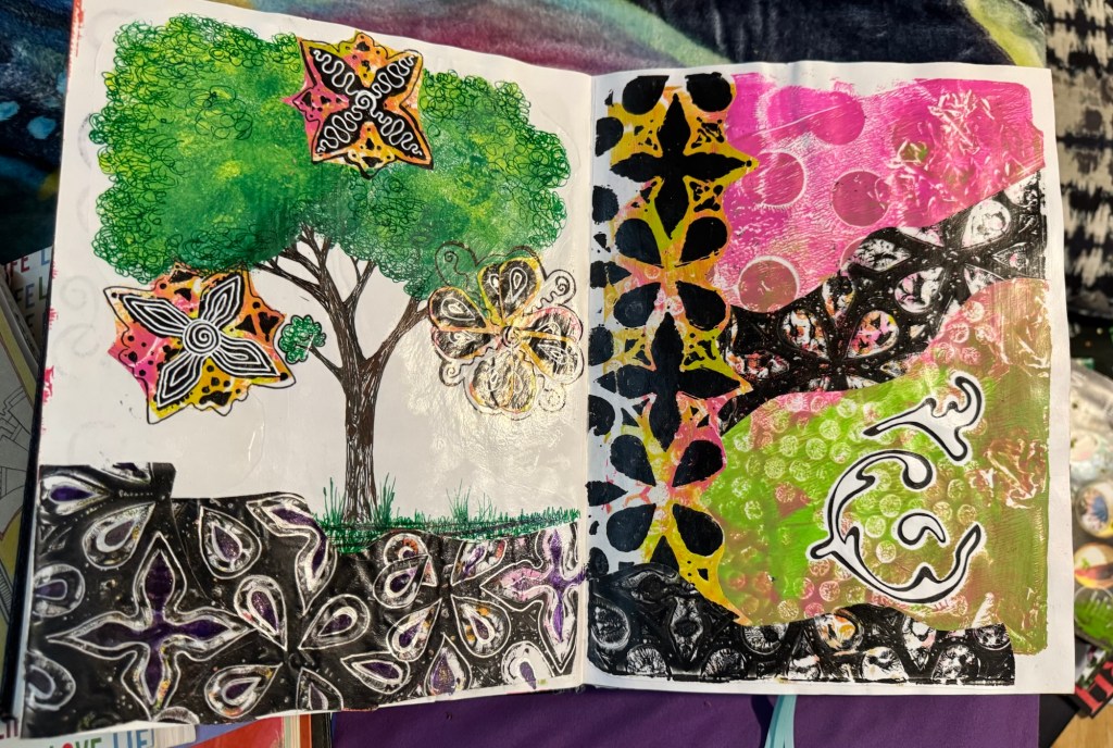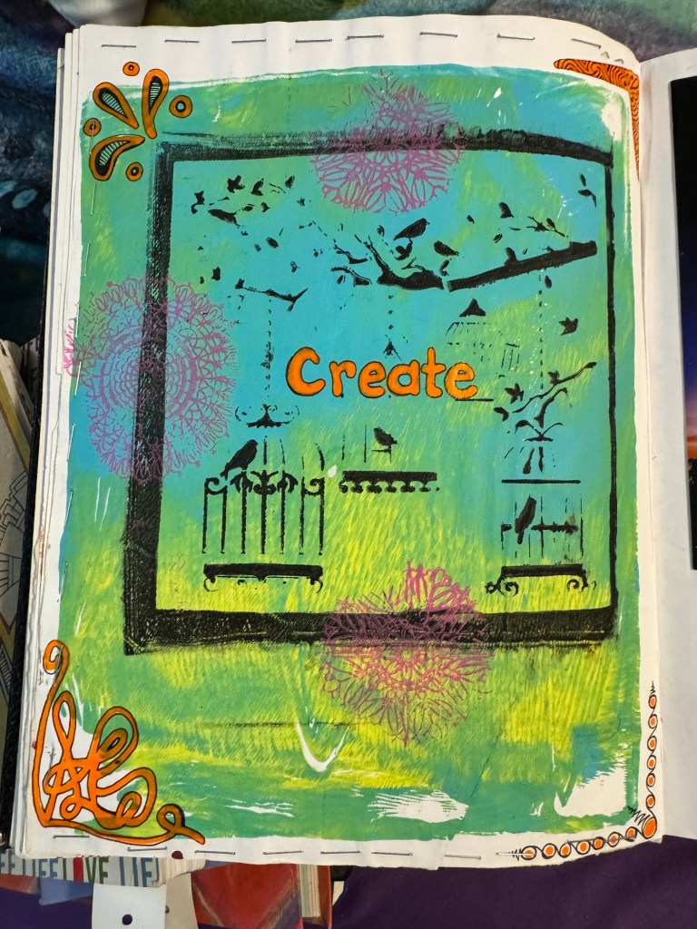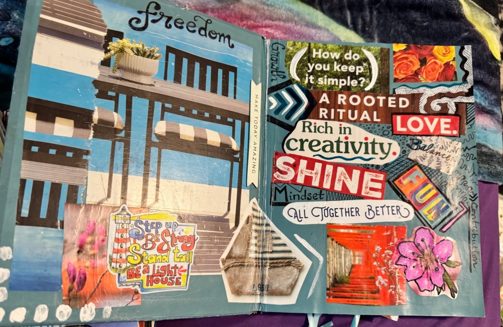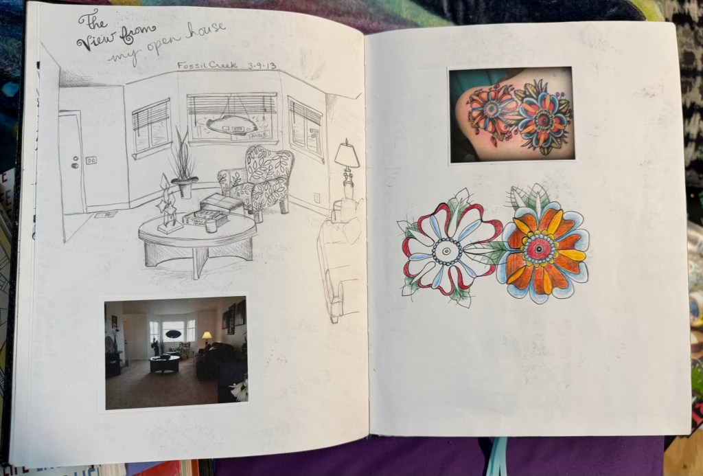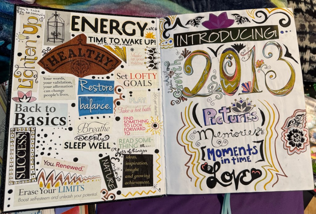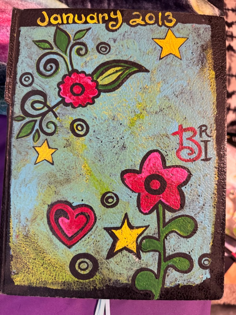 The third is my day-to-day notebook. For this one I love the $10 sketchbooks that are Michael’s brand. It’s where I track astrology, moon cycles, and jot down inspiration from daily meditations. Recently, I came across an older version of this kind of notebook and was struck by how much art I included back then. These days, my day-to-day notebook is mostly text—but flipping through that older one inspired me to bring more creativity back into my daily practice.