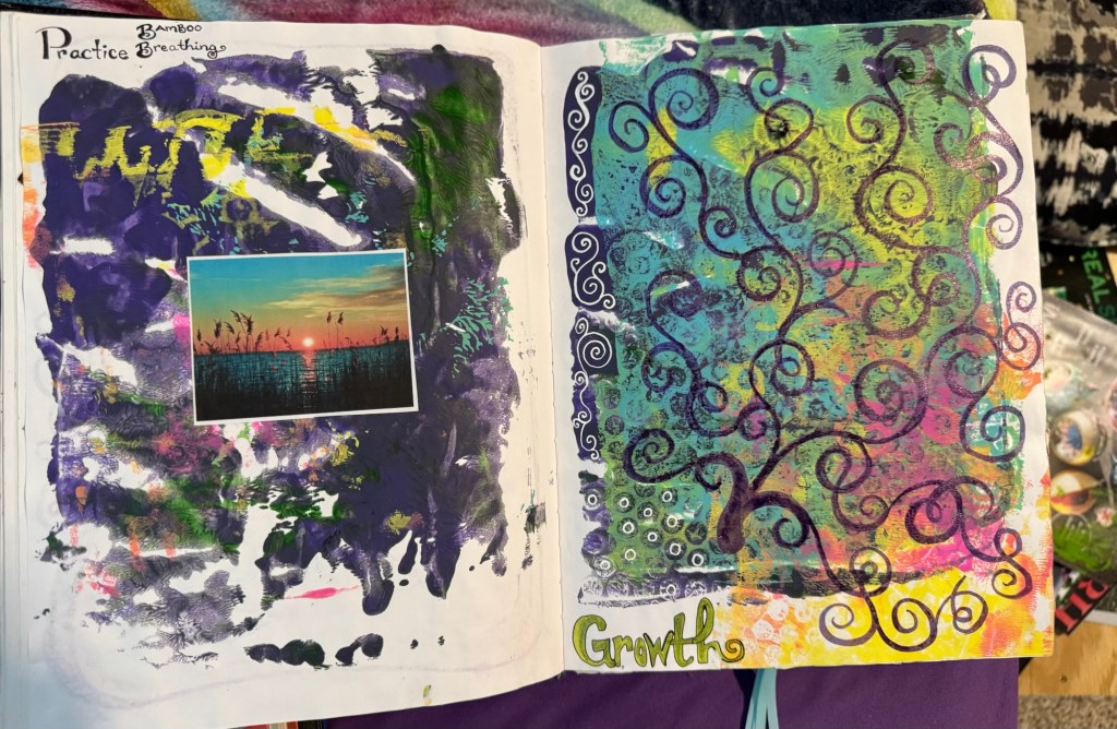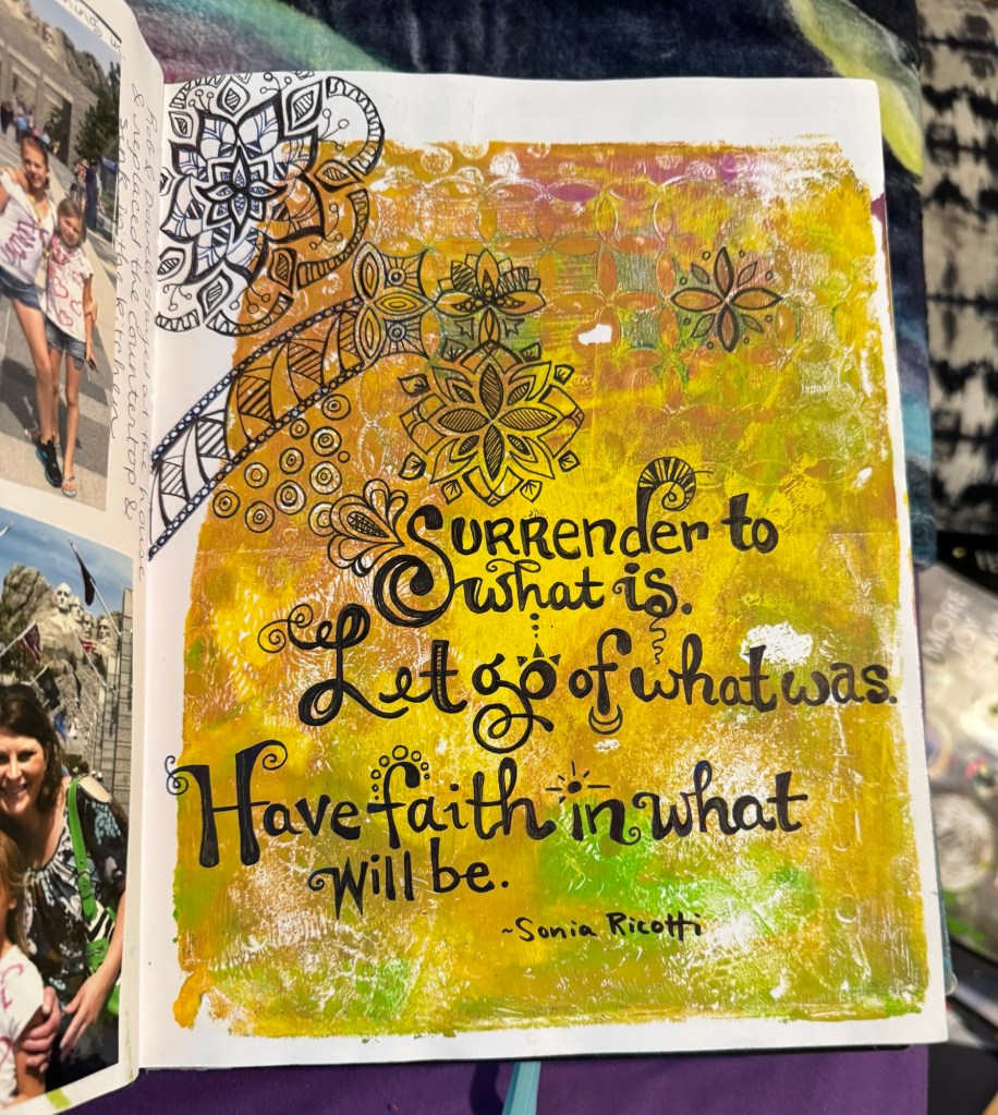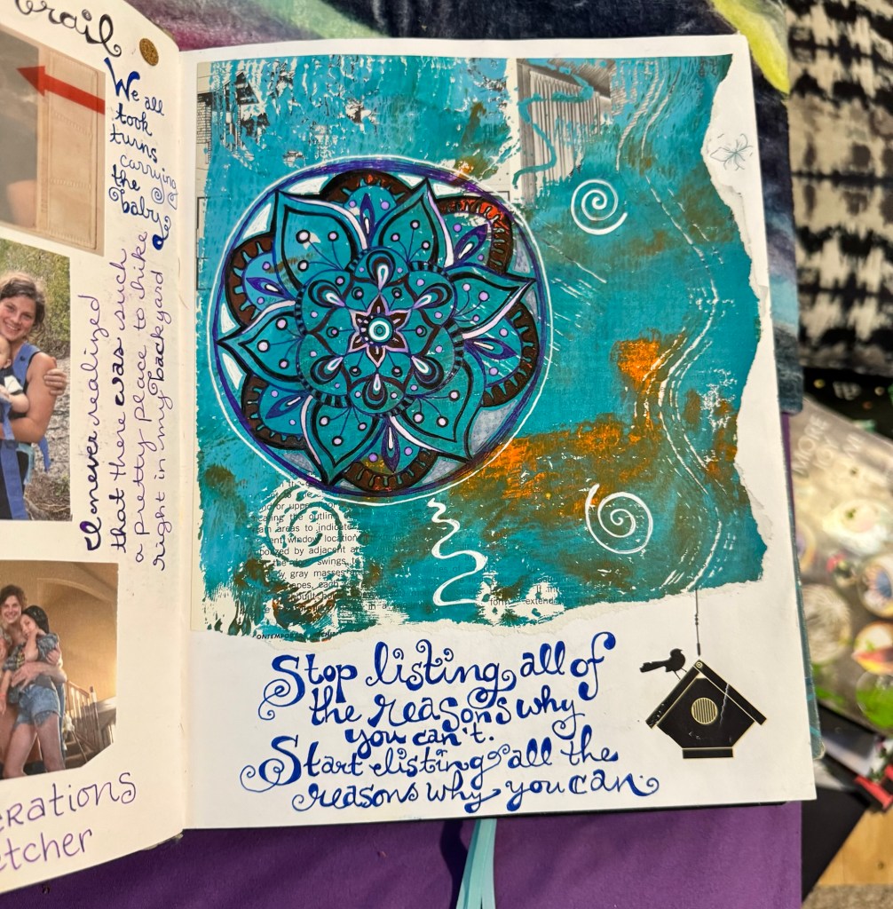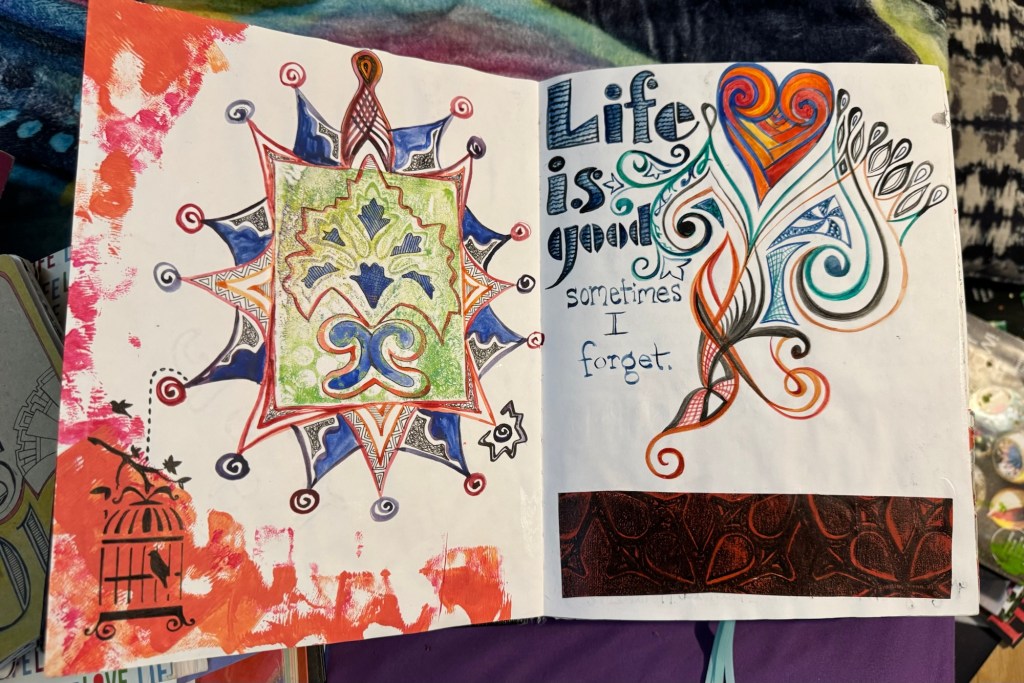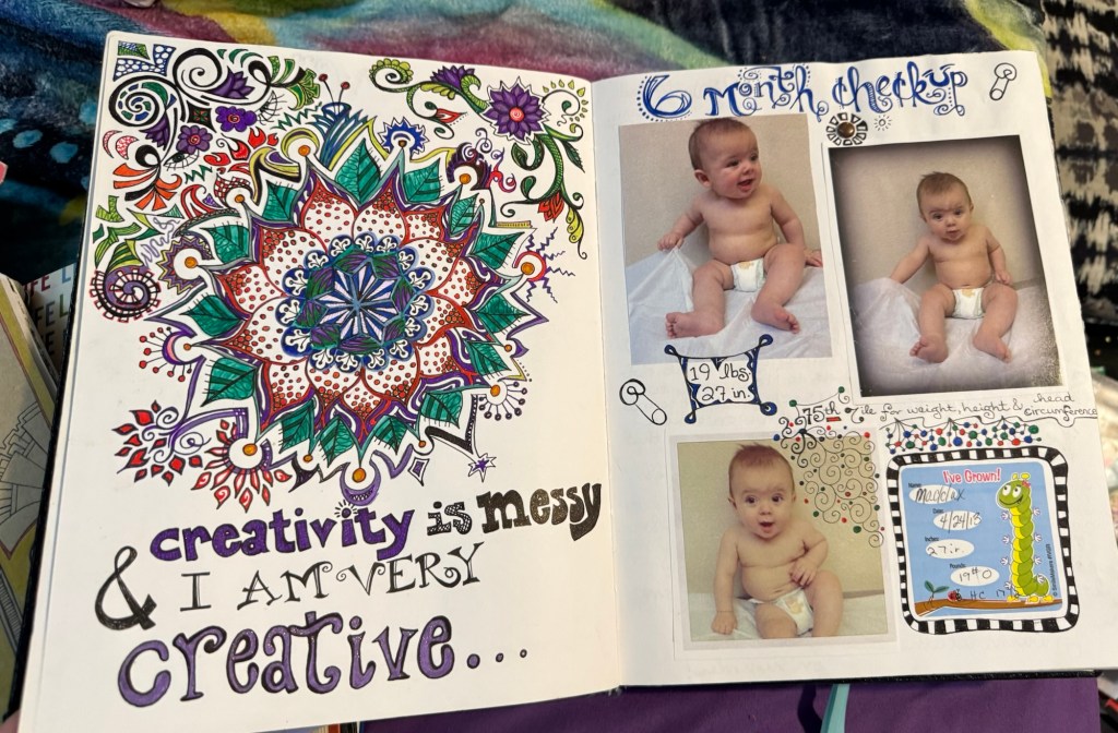 The second is my art journal. I use the Ranger Dylusions Creative Journal (see them here). I love these because there’s a pocket for all the ephemera we pick up day to day and because the paper can hold up to paint, collage and pretty much anything. This one is a mix of freestyle scrapbook, gratitude journal, and junk journal. It’s where I document moments so that time doesn’t slip away unnoticed. When I look back, I can see what happened on a random Thursday eight years ago. My hope is that my kids will treasure these glimpses into my life someday.