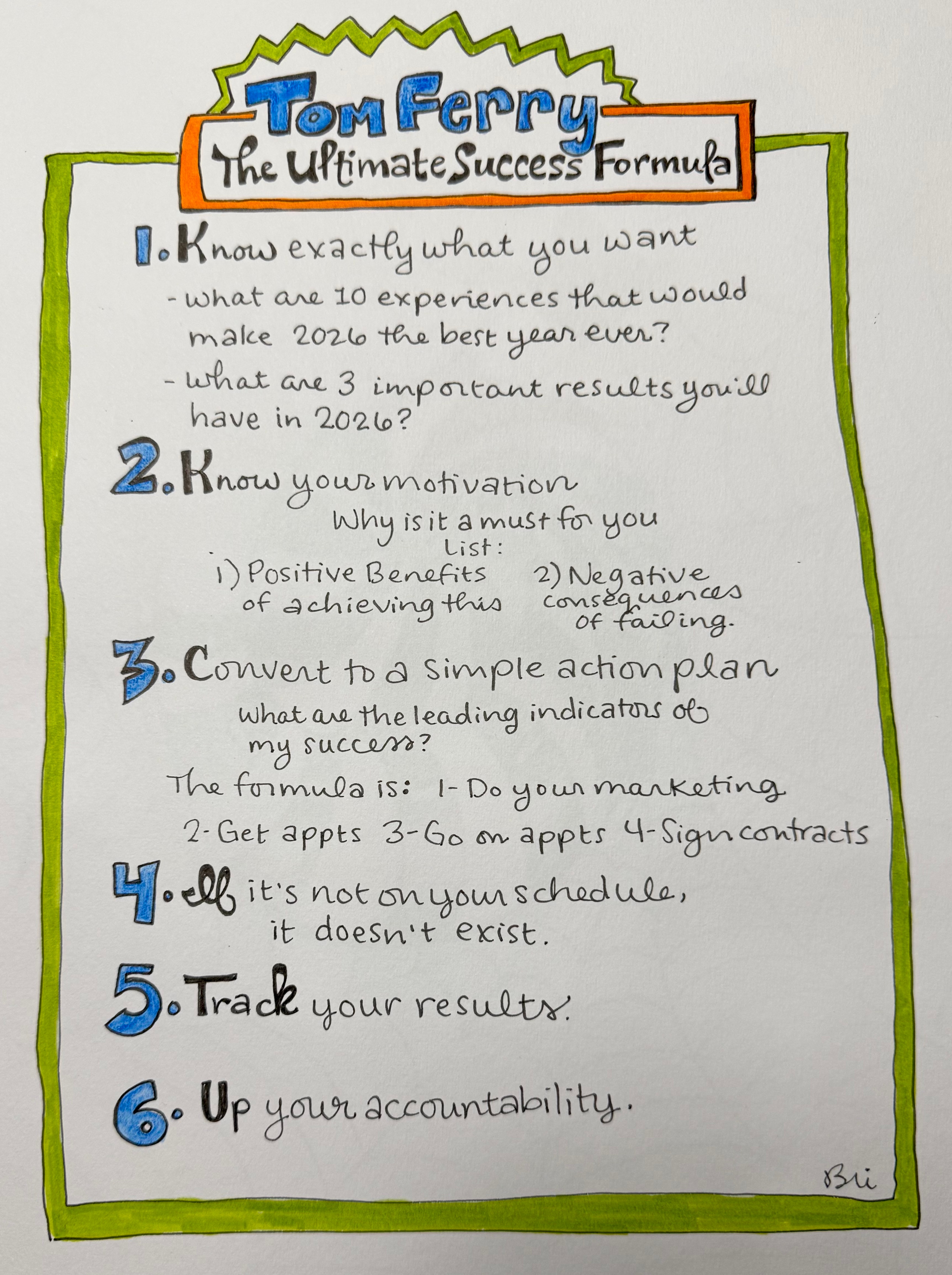 Over the last few weeks, I’ve been deep in planning mode myself — mapping out 2026, revisiting what worked (and what seriously didn’t), and leaning into the frameworks that help me stay grounded and motivated. Between Tom Ferry’s Ultimate Success Formula, daily mindset work, and my own sketchnotes from years of conferences, this is the season where things start to click into place.